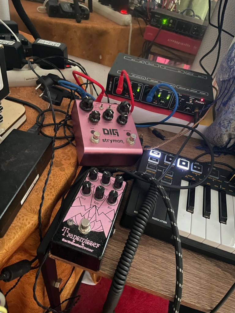 The other two tracks focus on the Transmisser — with its enveloping reverb and wrap filter that consumes the sound entirely — and the Time Shadows, which offers three different functions, including a hidden one. The setup is about chaining one of the EQD pedals into the Strymon Dig and running the stereo output into my audio interface. In Ableton, this stereo signal is recorded on two separate stereo tracks, allowing for a back-and-forth effect, like a ping-pong delay, that can be saved as a sort of homemade synth bank. The Strymon Dig serves as a stereo router, letting me process the sound further with envelope filters and different features in Ableton, which will make reproducing these sounds simple in concert. The plan is to handle these sounds with a MIDI keyboard, laying down one of the foundational layers of the recording, set for release in 2025.